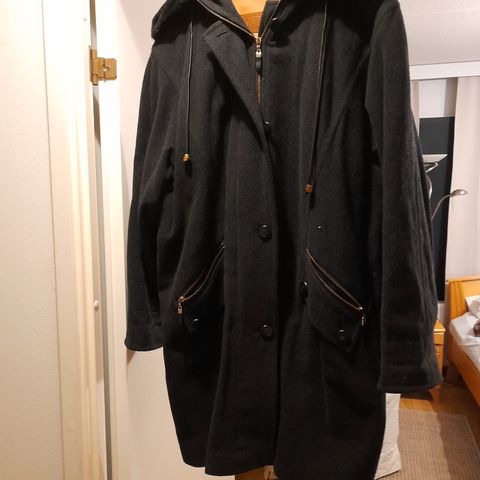 Perinteinen naisten pitkä villasta valmistettu takki kaksirivisellä napituksella.