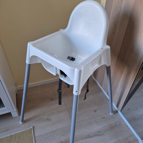 IKEA syöttötuoli lapselle. Valmistettu puusta, korkea malli, jossa selkänoja ja kaareva turvakaari. Tuolissa on jalkatuki lapsen istuma-asennon tukemiseksi.