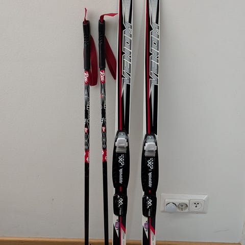 Hyväkuntoiset 150 cm pitkät muurtomaasukset siteineen sekä 110 cm pitkät sauvat.
