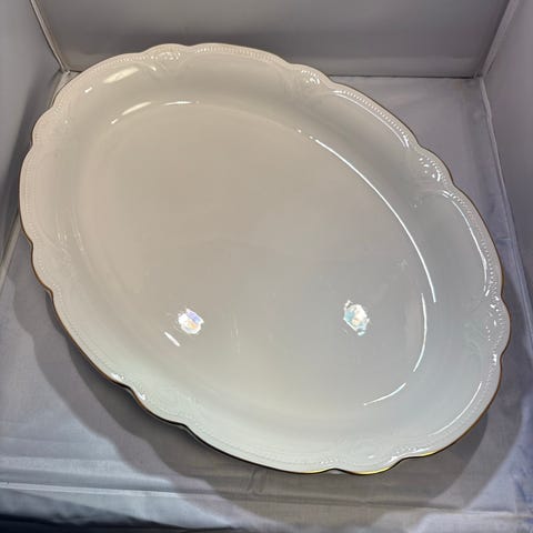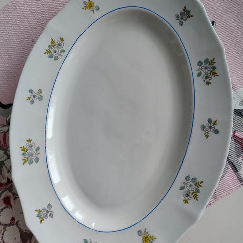 Arabia tarjoiluvati Sirkka -sarjaa, koko 23x32 cm, valkoinen pohja ja kukkakuviointi reunoilla. Soikea muoto, reunaa kiertää sininen koristelinja. Tätä sarjaa muutakin myynnissä. Toridiili, normipostitus tai nouto sopii myös. Pakkaan huolellisesti