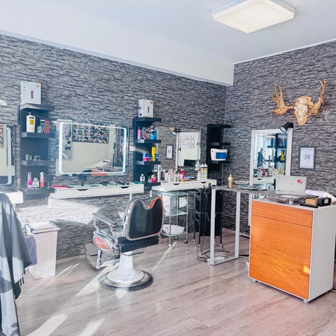 Kampaamon pesupaikka hiustenpesuallas ja tuoli musta valkoinen