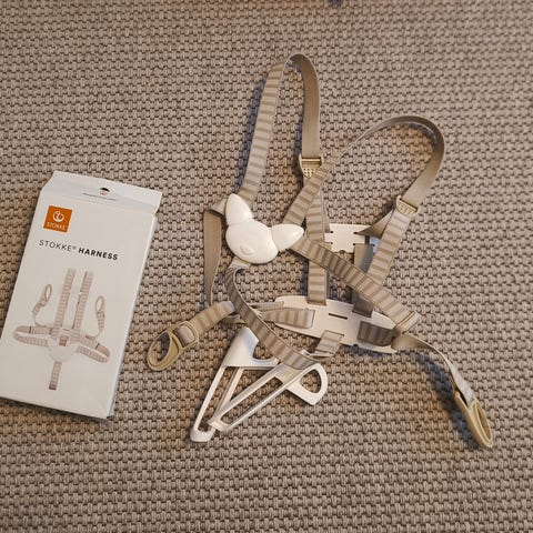 Stokke Harness turvavaljaat Tripp Trapp -syöttötuoliin säädettävillä hihnoilla. Nämä ovat roikkuneet käytännössä käyttämättä syöttötuolissa vuoden. Lapsi ei ollut fani.