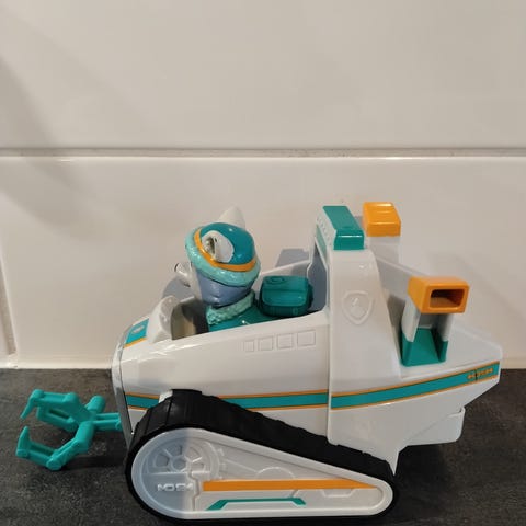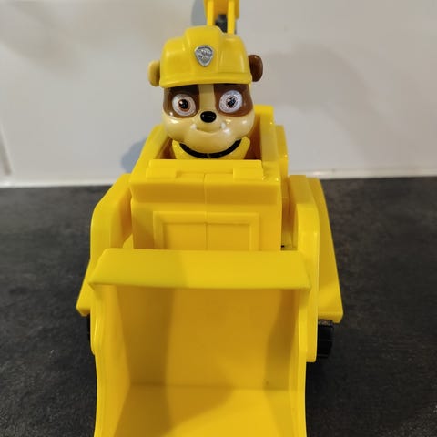 Ryhmä hau eluauto ja Rolle hahmo. Keltainen rakennusauto. Mukana irrallinen Rolle-koirahahmo. Ehjä ja toimiva. Pientä kulumaa.