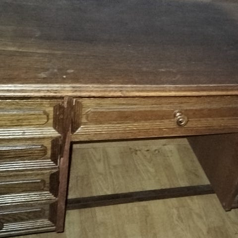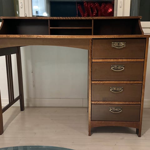 Tamminen kirjoituspöytä, umpipuu. Kaunis ja tyylikäs. On vähän käyttöjälkeä (näkyy kuvassa). Huomioitu hinnassa.
