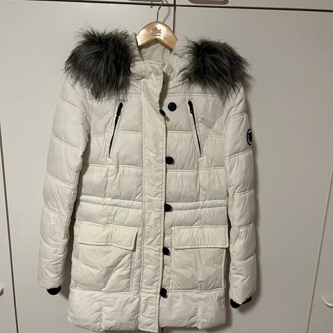 Hyväkuntoinen beige/punertava talvitakki,koko mieluummin pieni M.Hupussa karva,irrotettava karva/huppu