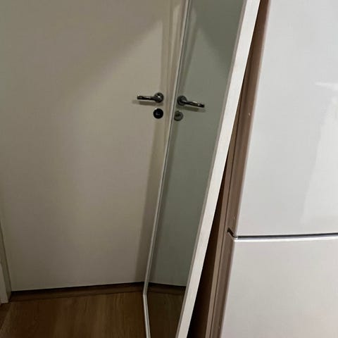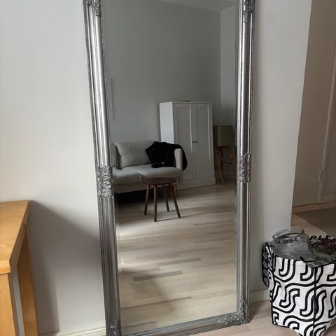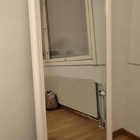 Jysk (muistelisin hankkineeni jyskiltä) kokovartalopeili valkoisella kehyksellä. Peili on seinään nojaava tai seinälle kiinnitettävä malli, sopii esimerkiksi eteiseen tai makuuhuoneeseen. materiaali maalattu puu tai puukuitulevy. Soveltuu yleiseen sisustuskäyttöön ja pukeutumispeiliksi.