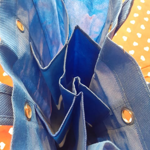 Turun Sanomat kangaspussi valkoinen. Kassissa on Turun Sanomien logo ja teksti ”Tilanteen tasalla. Lukijaa lähellä.” etupuolella. Yläreunassa on metalliset purjerenkaat ja nyörit, joilla kassi voidaan sulkea tai kantaa olalla. Soveltuu esimerkiksi lehtien, kirjojen tai muun pientavaran kuljettamiseen ja säilyttämiseen. Myös hyvä pyykkipussi.