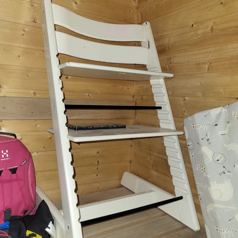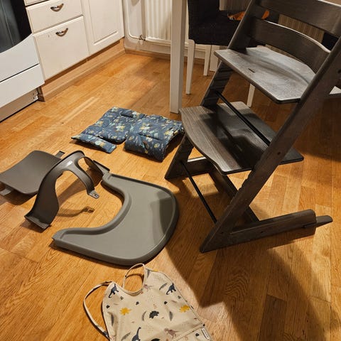 Myytävänä siisti, tumman ruskea Tripp Trapp- syöttötuoli.