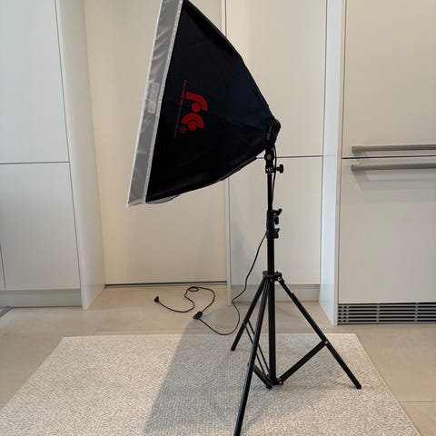 Falcon Eyes softbox-valaisin jalustalla. Valaisimessa on suorakaiteen muotoinen softbox-hajotin ja sisällä päivänvalolamppu. Jalusta on korkeussäädettävä kolmijalka. Sopii esimerkiksi valokuvaukseen ja videokuvaukseen tasaisen ja pehmeän valaistuksen tuottamiseen sisätiloissa.