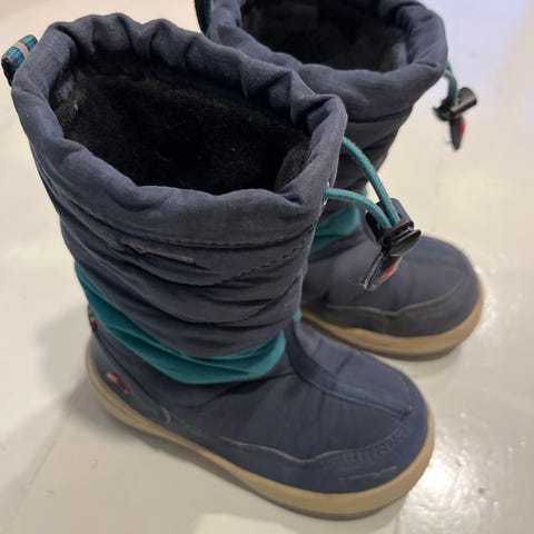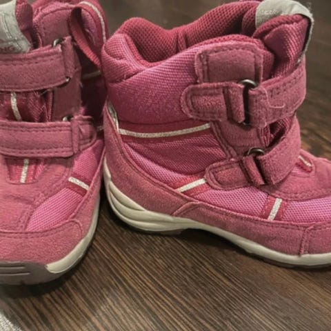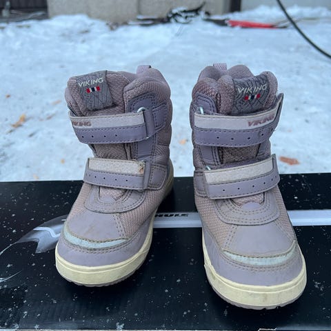 Viking lasten talvikengät tytöille, koko 24. Väri pääosin pinkki, tummanvioleteilla yksityiskohdilla. Kengissä on lämmin vuori ja paksu, kuvioitu ulkopohja, joka antaa pitoa liukkaalla. Varsiosa on pehmeä ja kiristettävissä yläreunasta, mikä auttaa pitämään lumen poissa kengästä. Soveltuvat kylmään säähän ja ulkoleikkeihin.