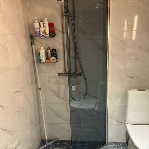 Huurrettu lasinen kylpyhuoneen ovi ja karmit. Kuvista näet oven yksityiskohdat sekä molempien karmien alaosat, joissa toisessa näkyy kosteuden aiheuttamaa jälkeä. Kosteus johtuu suihkusta tulevista roiskeista. Ovi on saranoitu karmiin ja siinä on metallinen kahva, jossa lukko. Ovi on 9 vuotta vanha, lasi ja lukko ovat virheettömiä.