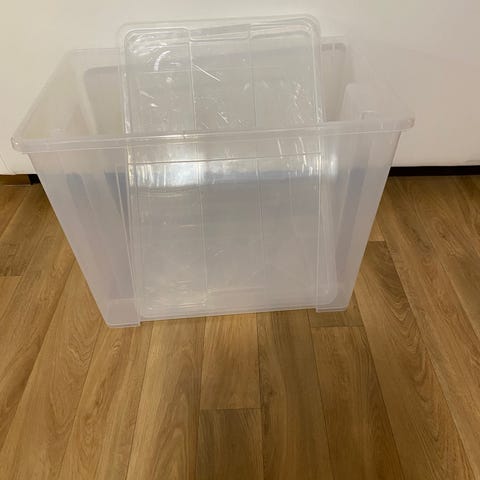 Muovilaatikoita, 25l, pituus 44cm, leveys 33cm ja korkeus 25cm.