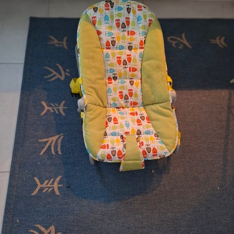 Fisher-Price vauvojen sitteri. Käytön jälkiä on, mutta tuote on ehjä ja siisti. Soittaa paristoilla musiikkia ja surisee. Keinumisen lisäksi jalat on mahdollista lukita, jolloin istuma-asento on pystympi. Päällinen on irrotettava ja pestävä.