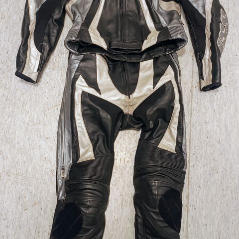 IXS nahkainen ajopuku, koko 52. Yksiosainen moottoripyöräajopuku, jossa musta, valkoinen ja keltainen väritys. Puvussa on vahvikkeet ja joustopaneelit liikkumisen helpottamiseksi sekä polvien kohdalla lisäsuojaukselle varatut alueet. Soveltuu moottoripyöräajoon ja rata-ajoon suojaavaksi ajovarusteeksi. Ostettu käytettynä, ei reikiä mutta kulumaa löytyy.