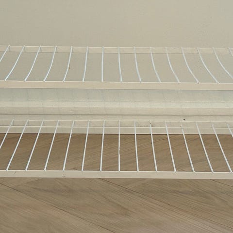 Valkoinen ritilämallinen kenkäteline. Esimerkiksi vaatekaappiin, siivoushuoneeseen tai varastoon. Leveys 82 x syvyys 30 x korkeus 25 cm. Vain nouto.