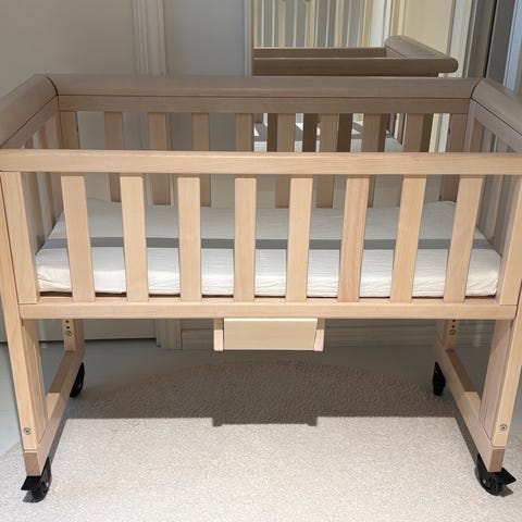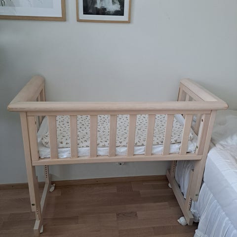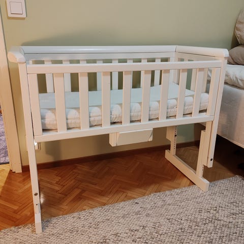Sivuvaunusänky, jossa säädettävät jalat. Toisen sivun saa näppärästi laskettua. Tukeva sänky ja meillä vauva mahtui nukkumaan tässä yli puoli vuotiaaksi asti. Pientä käytönjälkeä löytyy. Ainoana moitteena päädyn koristekaiteesta puuttuu toinen ruuvi, tämä ei kuitenkaan vaikuta käyttöön ja on helposti korjattavissa.