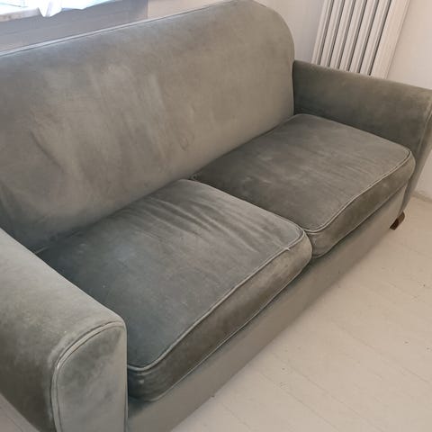 Sohva ehjä, pesua vailla, tukeva. Toisessa istuin tyynyssä painaumaa vähän.