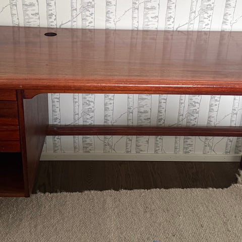 Hyväkuntoinen puinen työpöytä kaapilla ja vetolaatikokilla. Pöytäkansi irrotettavissa helppoon kuljetukseen.