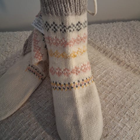 Kuvan HYVÄT 7- veljes langasta villasukat. Mukavan tilavat, pehmeät ja kauniit, itsellesi tai lahjaksi. Löydä muutkin ihanat sukkani Torin uumenista.