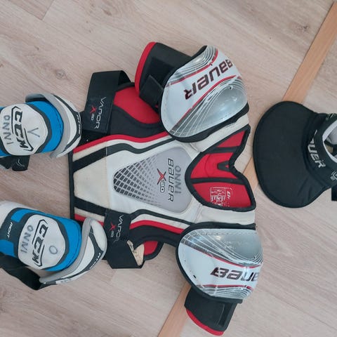 CCM säärisuojat ja rintapanssari juniorikäyttöön. Polvisuojat kokoa 12"/30cm ja rintapanssari junior large. Asiallinen käytetty kunto, katso kuvat.