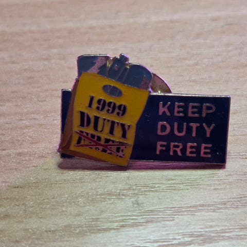 Golden Gate Bridge -pinssi. Metallinen pinssi, jossa värillinen kuva Golden Gate -sillasta. Ostettu San Fransiscosta 90-luvulla.