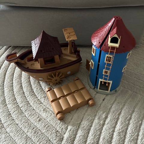 Muumi leikkitalo, kaksiosainen sininen muumitalo punaisella katolla. Talossa on useita kerroksia, portaat ja sisätilat leikkeihin. Mukana useita muumihahmoja ja pieniä kalusteita, kuten pöytiä ja tuoleja. Soveltuu lasten leikkeihin muumiteemalla sisätiloissa.