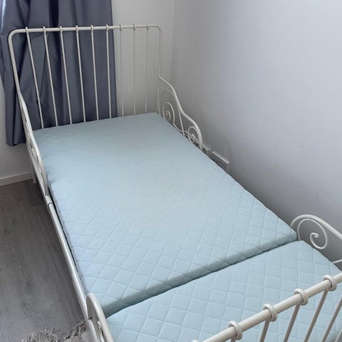 Jatkettava lastensänky, materiaalina puu ja värinä valkoinen. Sänkyä voidaan pidentää lapsen kasvaessa, joten se sopii eri ikäisille lapsille. Patja sisältyy hintaan. Patja kolmeosainen, mitat 80x200.