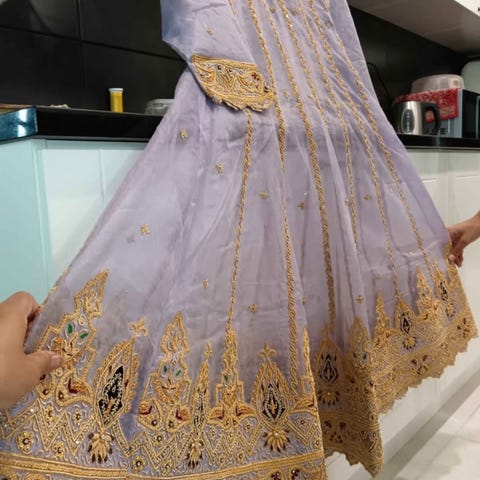 Runsas helma ja kauniit yksityiskohdat. Helmaosassa ja rinnuksissa kangas alla, selässä ei ole kangasta.
