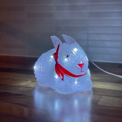 Istuva pupuvalaisin, yövalo, korkeus 58 cm. Söpö koriste. Ostettu joskus Suomesta, tuotemerkki ranskalainen Rose in April. Ei ole ollut valaisinkäytössä, lamppua ei kai saa vaihdettua kun se kuluu loppuun. Lisätietoa lampusta myyjiltä netistä: "lapsiturvallinen LED-yövalo, joka on valmistettu valkoisesta, pehmeästä PVC-muovista. Istuva, hyllyn reunalle sopiva lamppu on käsin viimeistelty, päätä voi kääntää, ja se antaa pehmeän valon. Valaisin on pitkäikäinen (yli 10 000–25 000 h) eikä kuumene." Nouto Helsinki, Vuosaari.