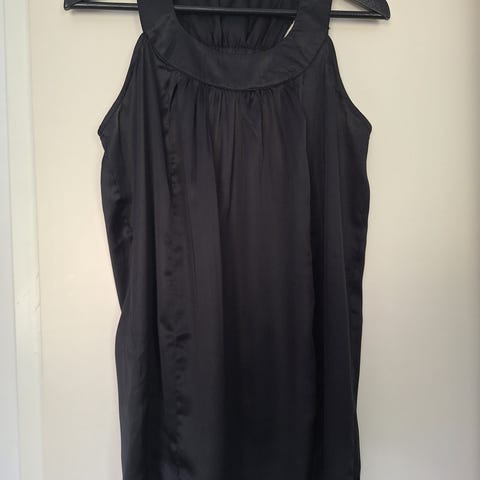 Musta joustava viskoosi-elastaanitoppi. Hihaton, mutta kaula-aukossa musta ohut frilla, josta muodostuu pienet hihat.