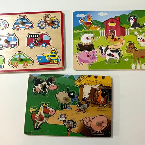 Myydään kolme erilaista nuppipalapeliä. Aiheina maatila, eläimet sekä liikenne.