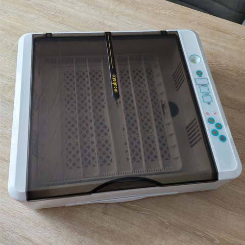 3 onnistunutta haudontaa tehty. On täysautomaattinen, lukee kosteuden ja kääntö toiminta myös. Rullat otetaan irti ennen kuoriutumista jotta kääntö lakkaa ja munat pääsee lepoasentoon ritilälle. 16 munan kone, mutta voi hautoa tietenkin pienempääkin määrää ja rullilla saa säädettyä väliä sopivaksi.