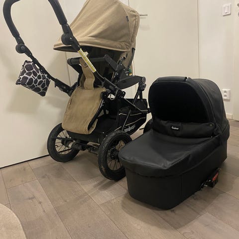 Settiin kuuluu erittäin kevyt ja juuri pesusta tullut istuinosa jossa todella pitkä kuomu. Ratasosasta en omaan silmään löytänyt moitteita.