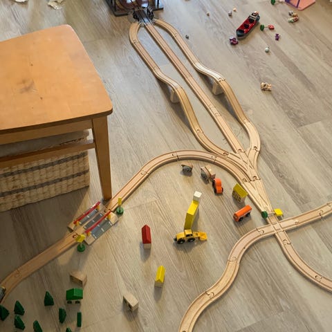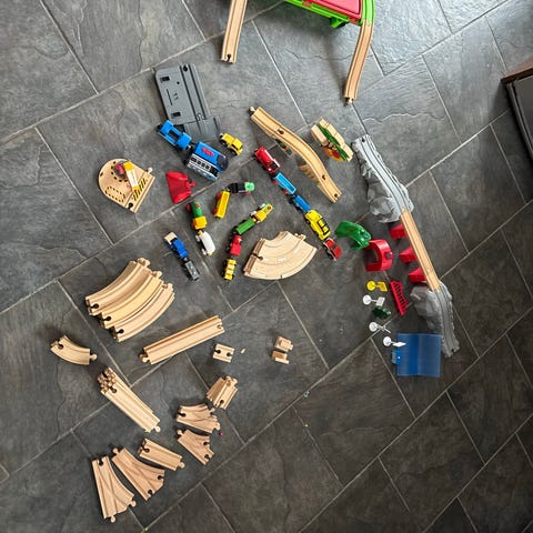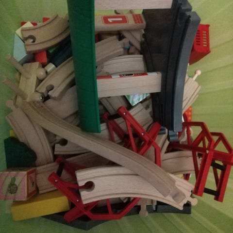 Iso kasa puujunaradan osia. Suurin osa BRIO-merkkisiä, mutta IKEA:akin mukana ja ehkä jotain muutakin. Kaikki kuitenkin yhteensopivia. On mäkeä, kaarta, vaihdetta, möykkyä jne. ja jopa dramaattinen romahtava silta!