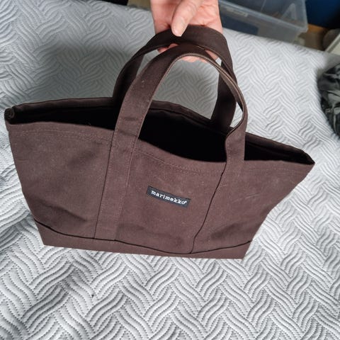 Marimekko Rilla rakastaa -kuosinen kangaslaukku, koko noin 17x17 cm. Materiaalina kangas ja vetoketjusuljenta.