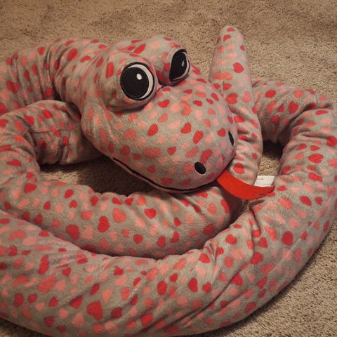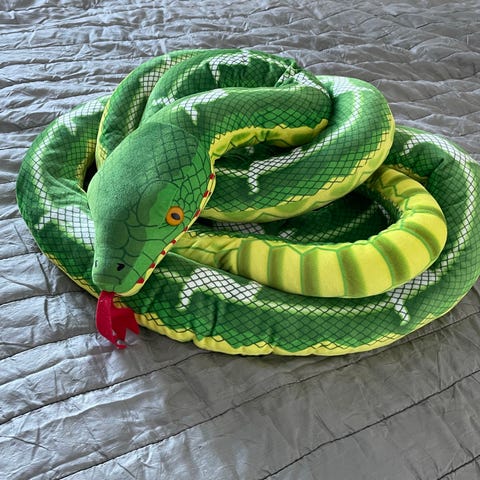 Pehmeän lötkö superpitkä lelukäärme uuteen kotiin.