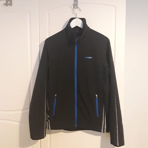 Muutaman kerran päällä ollut huomiotakki. Vettähylkivä takki softshelliä. Edessä neljä vetoketjutaskua. Korkea kaulus ja irrotettava huppu.
