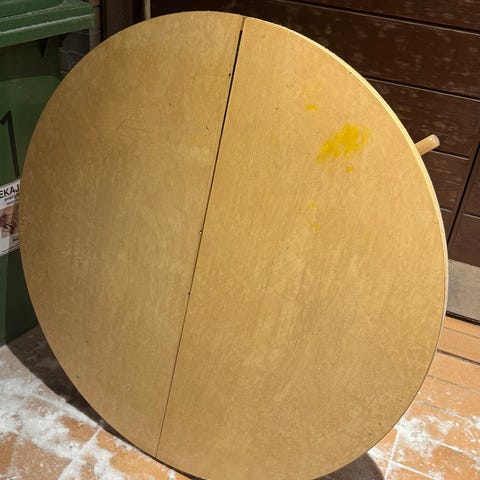 Pyöreä ruokapöytä. Kannessa pari pientä jälkeä. Puiset jalat. Annetaan pelkkä pöytä, ei tuoleja.