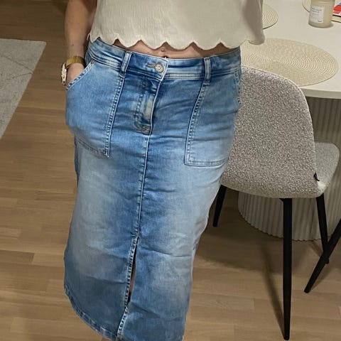 Naisten sininen farkkuhame kokoa 38. Neljätaskuinen malli, edessä "timanttinappi" ja osittain oikea etutasku "timanteilla", takana taskut, vyölenkit vyötä varten. Edessä nappi- ja vetoketjukiinnitys, helmassa halkiot sivuilla liikkumisen helpottamiseksi. Sopii arkeen ja vapaa-aikaan yhdistettäväksi erilaisten yläosien kanssa.