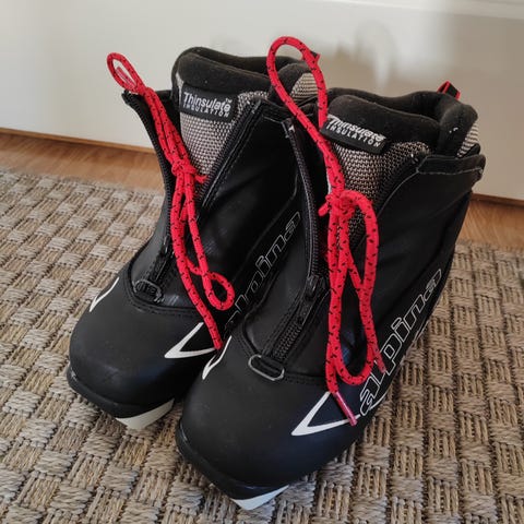Alpina T5 Plus hiihtomonot. Perinteisen tyylin monot, joissa Thinsulate-eristys ja nauhojen päälle tuleva vetoketjullinen suojaläppä. Väri musta punaisin yksityiskohdin. Sopivat NNN-sidejärjestelmään. Yhden talven ollut käytössä, ja pääasiassa muutaman kouluhiihdon verran. Koko 33