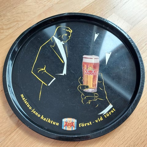 Myydään hieno Porin olut -metallitarjotin, halkaisija 30 cm. Tarjottimessa on kulumaa ja ajanpatinaa. Nouto tai postitus.