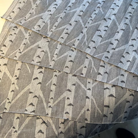 Lapuan Kankurit Seita laudeliinat 46 x 60 cm. Harmaasävyinen pellavainen laudeliina, jossa kudottu poro- ja symbolikuvio. Materiaalina pellava-puuvilla.