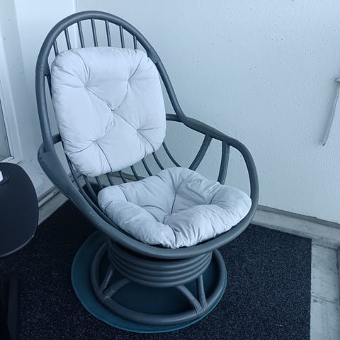 Myydään musta rottinkituoli. Irroitettava istuintyyny polyesteria, joka kestää myös aurinkoa. Pyörivä istuinosa ja säädettävät jalat. Jäänyt vähälle käytölle.