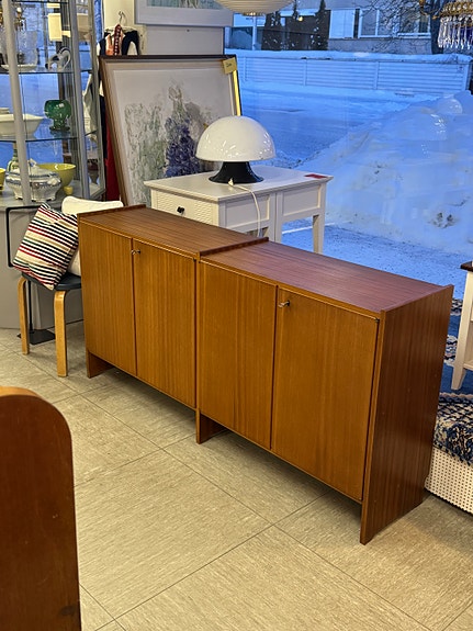 Kaunis tiikkinen työpöytä. Harvinainen malli. Siisti pinta. Avain kaappiin. Kauniit tiikkitasot sivulla metallipidikkein. Käytön jälkiä voi olla.