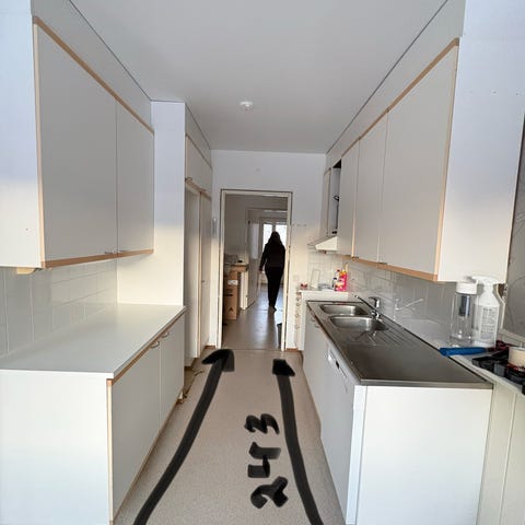 Valkoinen keittiökaapisto laminaattitasolla ja kodinkoneilla
