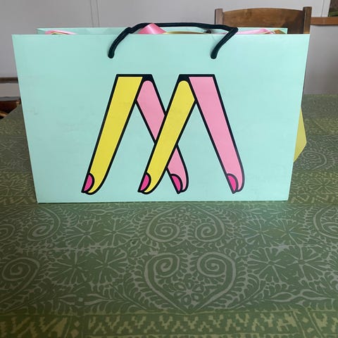 Minna Parikan vanha paperikassi (”sormellinen”). Ehjä, vaaleanpunaisessa osassa ulkopuolella vähän tahroja (kulumaa), ei koitettu pyyhkäistä millään pois. Silkkinarut ja kahvat ehjät. Pohja moitteeton.