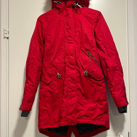 Erinomaisessa kunnossa oleva Didrikssonin Parkatakki. Vedenpitävä. Lämmin vuori. Koko 34. Väri luonnossa hieman tummempi punainen.