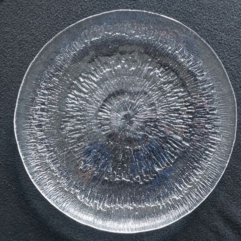 Iittala Solaris lasilautanen kirkasta lasia. Lautasessa on sarjalle tyypillinen orgaaninen, jääpintaa muistuttava kohokuviointi. Sopii esimerkiksi kattaukseen alkuruoka-, jälkiruoka- tai tarjoilulautaseksi (halk 25cm).