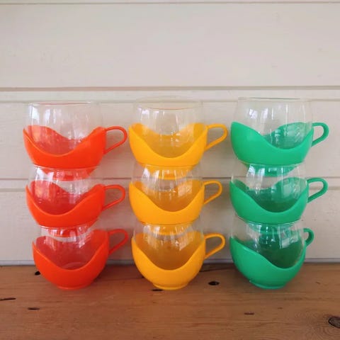 Keltainen, punainen ja vihreä kuumajuomalasi irrotettavalla muovisella pidikkeellä. 1970-luvulta.