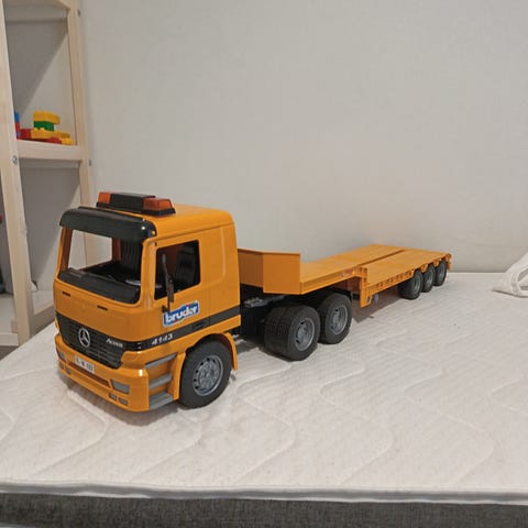 Scania leikkikuorma-auto. Punainen ohjaamo ja sininen kippi-/lavarakenne. Kuorma-autossa on nostettava ja kallistettava lava, jonka avulla lastia voi purkaa. Sopii leikkikuorma-autoksi lapsille sisä- ja ulkoleikkeihin. Muovinen malli, jossa yksityiskohtainen Scania-keula ja pyörivät renkaat.